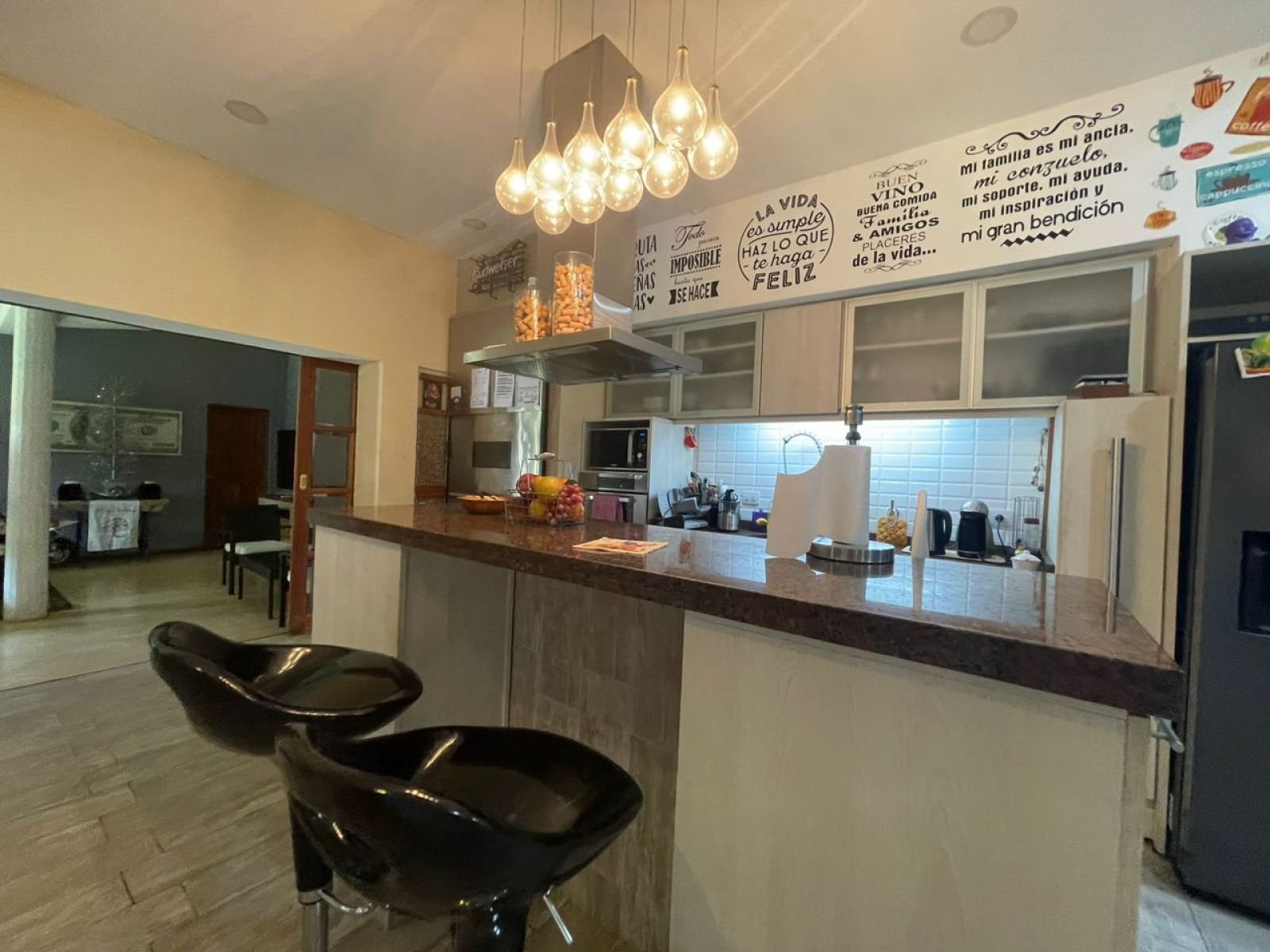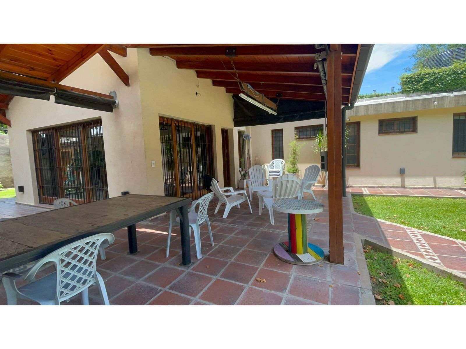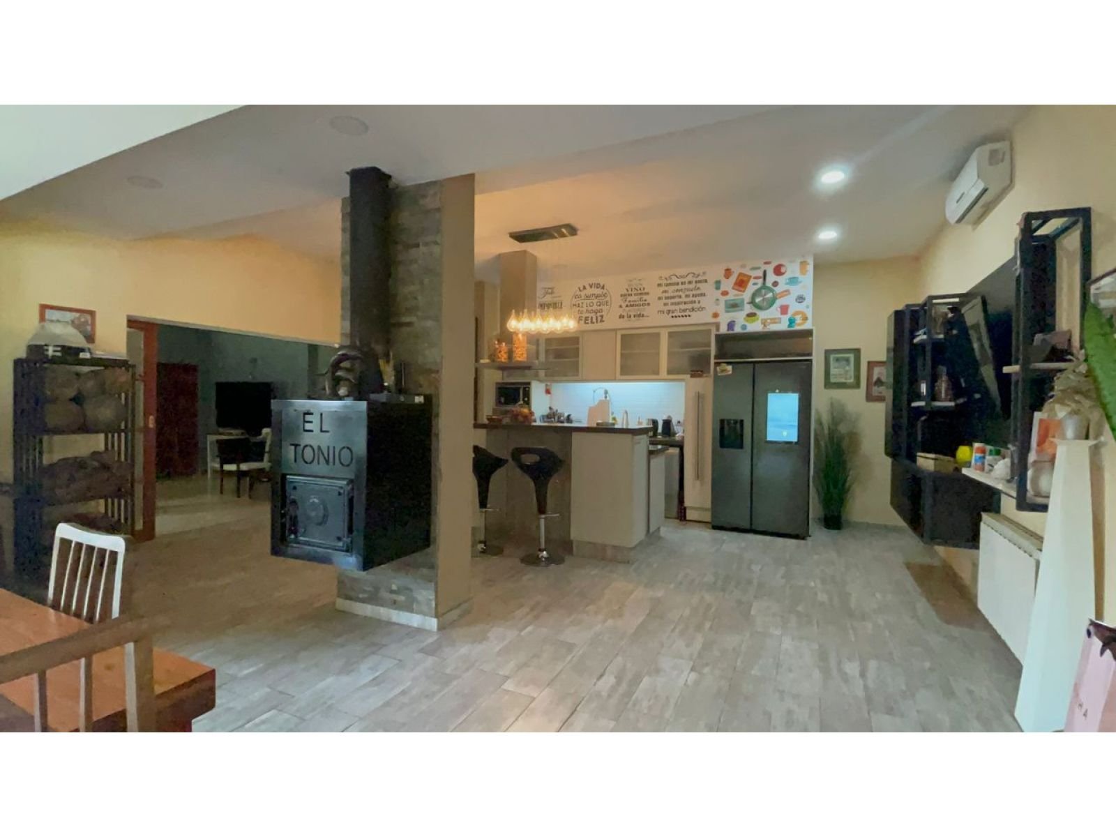 Ubicada a una cuadra del Jockey Club de Rosario y de la rotonda Wilde y Córdoba. Presenta un amplio comedor con ventanales al parque, toilette con ante baño y un hogar a leña que lo separa de la cocina. La misma cuenta con dos frentes y una isla amoblada con alacenas, mesada y bajo mesada. Espacio de horno empotrado con mueble a medida, lugar para microondas, lavavajillas, heladera, cava y anafe con extractor de aire. Además cuenta con una parrilla totalmente cerrada con acero inoxidable. Desde la cocina, por el lado derecho se encuentran las 2 habitaciones con baño en suite y vestidor. Por el lado izquierdo, a través de una puerta de madera corrediza se ingresa al cómodo espacio de living, que cuenta también con ventanal y una puerta que da acceso a la habitación de servicio con salida al patio. También cuenta con espacio de despensa y lavadero con caldera, termotanque y conexión para lavarropas. - Doble cochera techada y bicicletero. - Amplia galería con cerramientos de toldos totalmente equipada con parrillero, mesada de mármol, bacha, bajo mesada y alacenas. - Piscina cercada de 3,50 x 6, con solarium humedo. - Toilette exterior con ante baño - Segundo parrillero con mesada, bacha y barra. - Cuarto de guardado. - Sistema de alarma y cámaras. - Parque con riego artificial. Todos los ambientes cuentan con aire acondicionado y radiadores, además de cortinas de black out automatizadas. La construcción de la casa es de excelente calidad. Los muros son de ladrillo, parte del techo es de chapa con vigas de madera y cielorraso de machimbre, también parte de losa con cielorrasos de yeso.